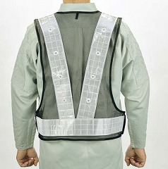 正面8個・背面8個の赤色LEDが点滅するので、夜間でも認識しやすい。両側ファスナーでウエストサイズが調整可能です。
