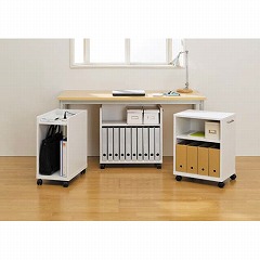 デスク周り整理のため木製ワゴン。棚板は3cmピッチで調節可能なので収納物に合わせて設置可能です。