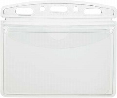 二つ折りタイプの名札ケース。2枚のICカードを2箇所に収容し、名札ケースを開いて別々に読取らせることで、エラーを防ぎます。透明プロテクター入り。