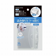 二つ折りタイプの名札ケース。2枚のICカードを2箇所に収容し、名札ケースを開いて別々に読取らせることで、エラーを防ぎます。ICカードを破損から守る透明プロテクター入り。お徳な10個パック。