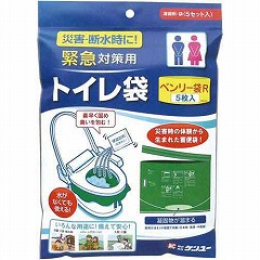 災害断水時に、素早く使える緊急対策用トイレ(緑色・5枚入)。水が無くても簡単に使えます。便器に被せて使います。殺菌剤入りの便凝固剤1個で、大人1人分の尿・便をゼリー状に固めます。