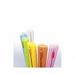 一般的な小型刃が使える設計。カラフル・キュート・コンパクトなデザイン。刃先にのりが付きにくいフッ素加工刃。刃をしっかり固定するオートロック機能付き。貝印製国産刃使用。横スライド式クリップ。