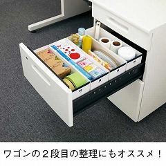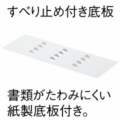 収納量は変わらずに、棚から引き出しやすい高さのローライズファイルボックス。ニス引き仕様でラベルやテープがはがしやすく、底板に巻き込み防止機能付き。ふせんがキレイに貼れるガイド印刷付き。