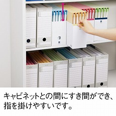 収納量は変わらずに、棚から引き出しやすい高さのローライズファイルボックス。ニス引き仕様でラベルやテープがはがしやすく、底板に巻き込み防止機能付き。ふせんがキレイに貼れるガイド印刷付き。