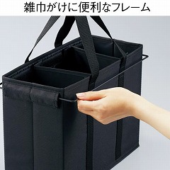 かさばる掃除用品を賢くひとまとめできるお掃除用品バッグ。持ち運び便利。収納も便利。スライド式仕切りで様々なサイズに対応。2本の物干し用フレームで簡単に雑巾も干せます。