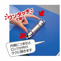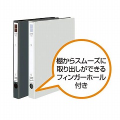 ワンタッチで開くリングを採用。リングを内側につまむとロックが外れラクに開きます。棚から取り出しやすいフィンガーホール付き。