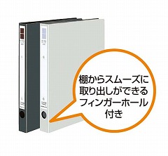 ワンタッチで開くリングを採用。リングを内側につまむとロックが外れラクに開きます。棚から取り出しやすいフィンガーホール付き。