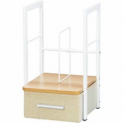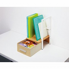 文具やボックスティシューを収納可能な引き出し付きのブックスタンド。