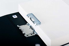 パイプにスリットが入っていて、つづりひもへの移し替えが簡単です。左右どちらからでも開けられる両開きタイプ。しかも金具の上側を押すので書類の量にかかわらず開閉しやすいファイルです。