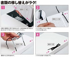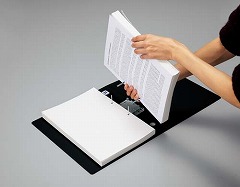 パイプにスリットが入っていて、つづりひもへの移し替えが簡単です。左右どちらからでも開けられる両開きタイプ。しかも金具の上側を押すので書類の量にかかわらず開閉しやすいファイルです。