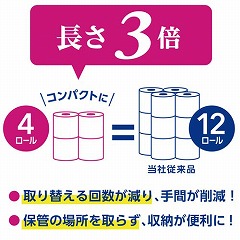 4ロールで12ロール分(25mロール換算)の長さ。たっぷり使えて収納コンパクト。