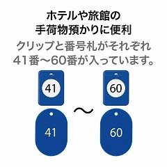 手荷物預かりに便利な番号札+クリップ式。ホテル・旅館、飲食店に最適。20番単位で購入できます。