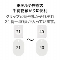 手荷物預かりに便利な番号札+クリップ式。ホテル・旅館、飲食店に最適。20番単位で購入できます。