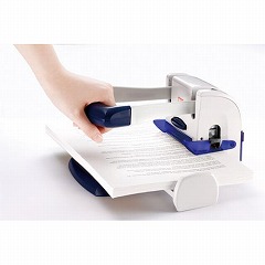 幅140mmのスリムな軽あけ120枚パンチ!紙押さえプレートで用紙がたわまずキレイに穴あけ。穿孔部にあんしんカバーが付いているので刃に誤って触れる事がなく安心。予備用替刃2本+刃受け2枚が付いてお得!