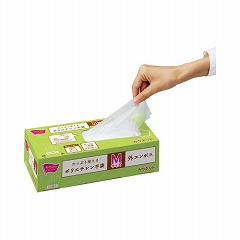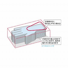 取り出し口が広くて取り出しやすいく、タテ置きでもヨコ置きでも使える便利なポリエチレン手袋。