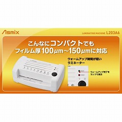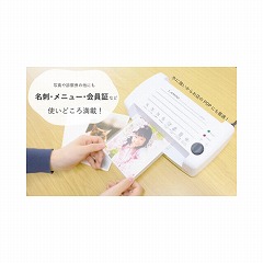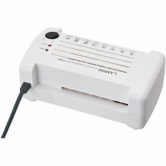 2本ローラーラミネーター。高速起動2.5分。はがきサイズ、150ミクロンまでラミネートできる。