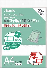 ラミネートフィルム。150ミクロン。A4サイズ。20枚入り。帯電抑制タイプ。