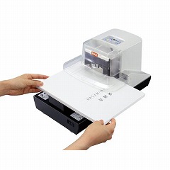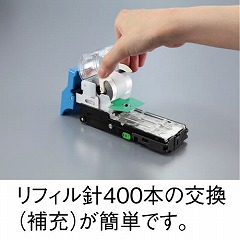 書類の枚数に応じて針足を最適な長さにカットする電動ホッチキス。同じ針で2枚でも110枚でもフラットクリンチできれいな仕上がり!