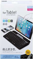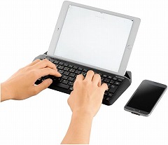 タブレットを立てられるスタンド付のBluetoothキーボード。最大3台までのマルチペアリングに対応。