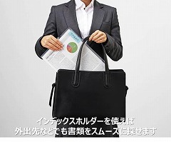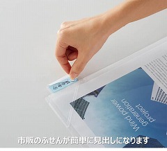 市販のふせんでカンタンに見出しを付けることができるクリヤーホルダー。見出しをつけると、書類がさがしやすくなります!カバー付きなのでふせんが傷みません。差し込むだけで書類の脱落を防止するストッパー付き。