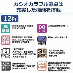 ●リバースキー:有、演算状態表示:有、四捨五入:無、税計算:有、切り捨て:無、メモリー:2、チルト:無、検算:無、切り上げ:無、早打ち:有、00キー、桁下げ、GTキー、特大表示、時間計算、傾斜表示