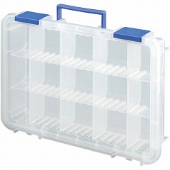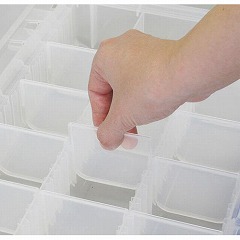 小物や部品をスッキリと整理できる収納ケース。持ち運びに便利なハンドル付。仕切りは自由に組み替えられます。