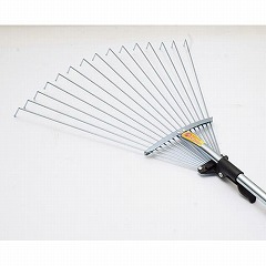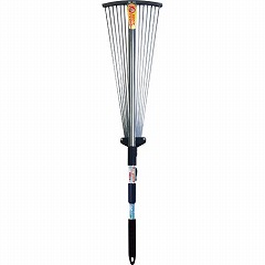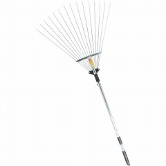 伸縮タイプなのでコンパクトに収納できる。スライド式で爪幅を調整できる。落ち葉などを集めやすく、芝生・お庭を傷つけない先端玉付き形状。