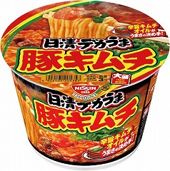 ポークベースのスープにキムチのクセになる味わいが特長の辛旨キムチオイルがうまさの決め手!の豚キムチラーメン。麺はスープ絡みの良さと噛み応えを追求した中太ちぢれ麺。大盛り麺90gで食べ応え抜群。