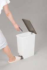 軽く踏んでサッと開くペダルペール。フタのカラー違いを並べればゴミの分別も可能です。