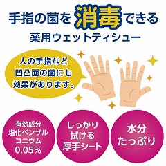 手指の消毒に、殺菌成分配合ですばやく消毒。有効成分塩化ベンザルコニウム0.05%配合。ふんわり厚手。無香料。