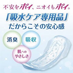 超強力消臭シートを新採用し、ニオイ安心!・お肌にやさしい素肌と同じ弱酸性のやわらかシート・安心の吸収力・立体ギャザーとサイドギャザーのダブルギャザーで横モレを防止・かわいい花柄エンボス・全面通気性
