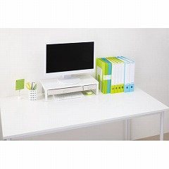 電卓など事務小物がスッキリ収納できる机上台。大きい引出しはA4サイズまで収納可能です。オフィスになじむホワイトカラーが登場。