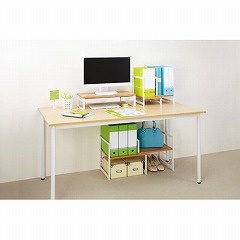 電卓など事務小物がスッキリ収納できる机上台。大きい引出しはA4サイズまで収納可能です。