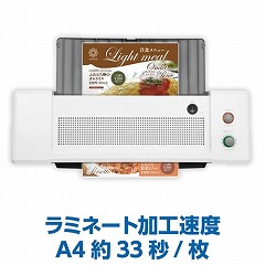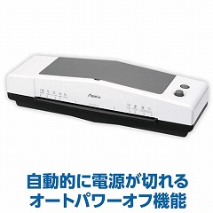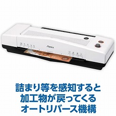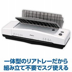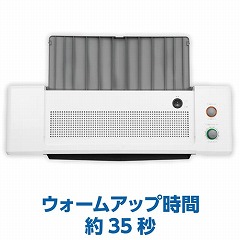 ウォームアップ35秒+加工時間39秒(A4紙)の4本ローラー時短モデル。トレーは本体据え付け型収納タイプ。オートリバース機能搭載で一定時間を過ぎても用紙が出てこないと自動的に逆転して詰まりを防ぎます。