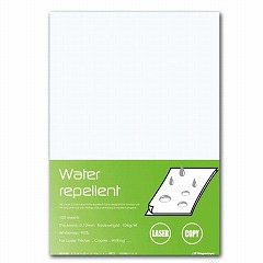雨に強い!水をはじくプリンタ用紙。上質紙の両面に撥水塗工が施されており屋外掲示物に適しています。コピーやレーザープリンタでの印刷や鉛筆・油性ペン等の筆記が可能です。