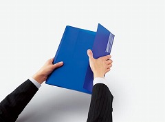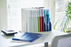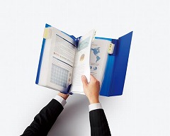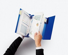 クリヤーホルダーを差し込んで簡単にまとめることができる。書類を探すときは大きく開いてパラパラめくれる。検索しやすく、持ち運びしやすい。