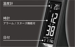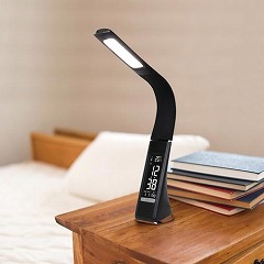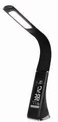 インテリア性のあるレザー調のLEDデスクライト。デジタル液晶表示カレンダー、温度、時間(アラーム、スヌーズ付)。フレキシブルアームで照明角度は自由に調節できます。高性能LED採用。AC/USB対応。