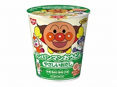 麺は柔らかめ、かつおだしがきいたすっきりやさしい味のつゆで、子供の食べやすさに配慮したおうどん。具材は、ネギに加え、アンパンマンとドキンちゃんのかまぼこ入り。