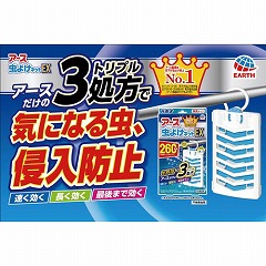 つるだけ簡単なネットタイプの虫よけです。3つの薬剤で、速く効いて、最初から最後まで虫よけ効果を発揮します。お取替えサイン付