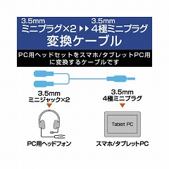 パソコン用ヘッドセットがスマートフォン/タブレットPCで使える。パソコン用ヘッドセット(φ3.5mmミニプラグ×2)をスマートフォン/タブレットPCに接続できる変換ケーブル。