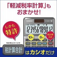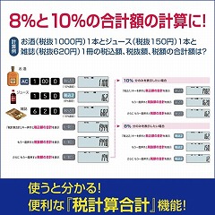 ●演算状態表示:有、四捨五入:有、税計算:有、切り捨て:有、検算:無、切り上げ:無、早打ち:有、3桁区切り、税率2通り設定、マルチ%、四則定数計算、概数計算、桁下げ、2つの税率の税込総額・税抜総額・税額が一発で算出可能な<税計算合計>キー、インボイス制度に対応、傾斜表示、オートパワーオフ