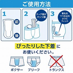紙パンツ用尿取りパッド。紙パンツと併用で経済的。2つ折り計上でラクラク簡単装着。簡単装着テープ2か所。股幅すっきり吸収体。消臭ポリマー。立体ギャザー。全面通気性。