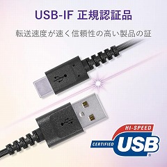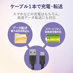 断線に強い高耐久モデル。USBStandard-A端子を搭載したパソコン・充電器と、USBType-C端子を搭載したスマートフォンなどの接続ができるUSB2.0ケーブル。