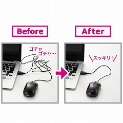 バッファローとカウネットの共同開発!ノートPCでの利用でケーブルが邪魔にならないショートケーブルマウス。高感度BlueLED採用で高い読取性能を実現。クリック音が気にならない静音スイッチを採用。