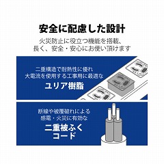 EU RoHS指令に準拠(10物質)した環境にやさしい、3P式4個口のマグネット付き抜け止めタップ。電源コードには、丈夫で安全性を向上させた二重被ふくケーブルを使用。