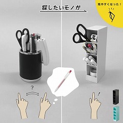 縦置き・横置き両用のペンスタンドです。仕切り板には傾斜がつき、ペンが交差することなくスムーズに出し入れが可能です。4段に分かれた収納スペースは消しゴム等の小物収納にも便利です。