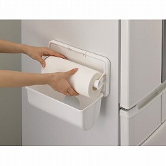 便利で清潔なカバー付きキッチンペーパーホルダー。マグネットと吸盤でしっかり固定。調理中でも片手でサッと切れるので便利。