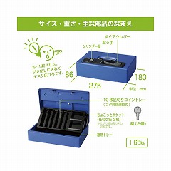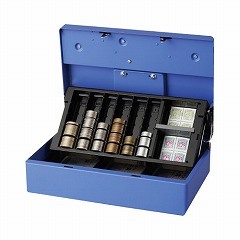 デスクの引き出しで管理できる薄型手提げ金庫です。上面操作によりスムーズな開閉が可能。上蓋と連動する自立トレーは硬貨の出し入れに便利です。トレーの下は3種類の紙幣が収納できます。