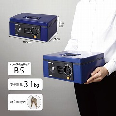 上蓋の開閉と連動する内蓋は、手提げ金庫の持ち運び時に生じる硬貨の飛散を防止します。紙幣用トレーは2段式で4種類の紙幣等を収納できます。不用意なダイヤル操作を防止するダイヤルロック機能付き。