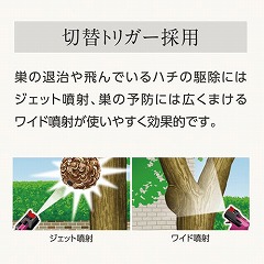 巣の退治と飛び回るハチの駆除はジェット噴射、巣作り予防はワイド噴射と切替可能なスプレータイプの駆除剤。速効成分+反撃されない成分で安心して駆除できます。